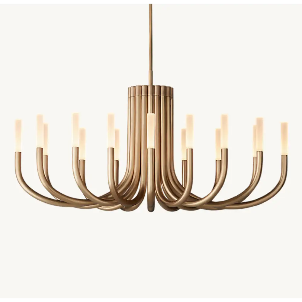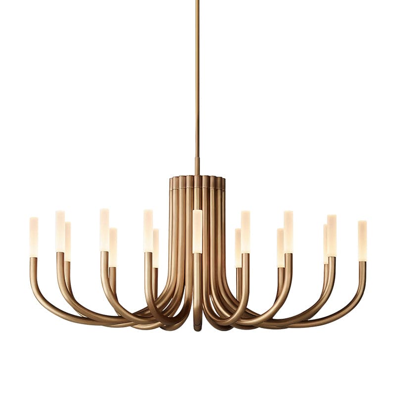 A sculptural 16-light chandelier built from sweeping curved copper arms rising from a solid central column. Available in 127 cm (50") and 96.5 cm (38") diameters, the fixture delivers a commanding architectural presence ideal for great rooms, dining rooms, double-height entries, and refined contemporary interiors.