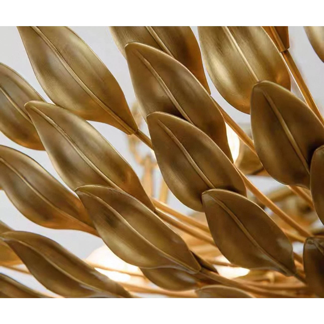 Foglie di ottone scolpite singolarmente formano una silhouette a nido rifinita a mano, proiettando una calda luce ambientale attraverso una cornice a filo dorata. Progettato per interni boutique con soffitti bassi e residenze ispirate a gallerie che cercano lavori in metallo artigianali con anima vintage.