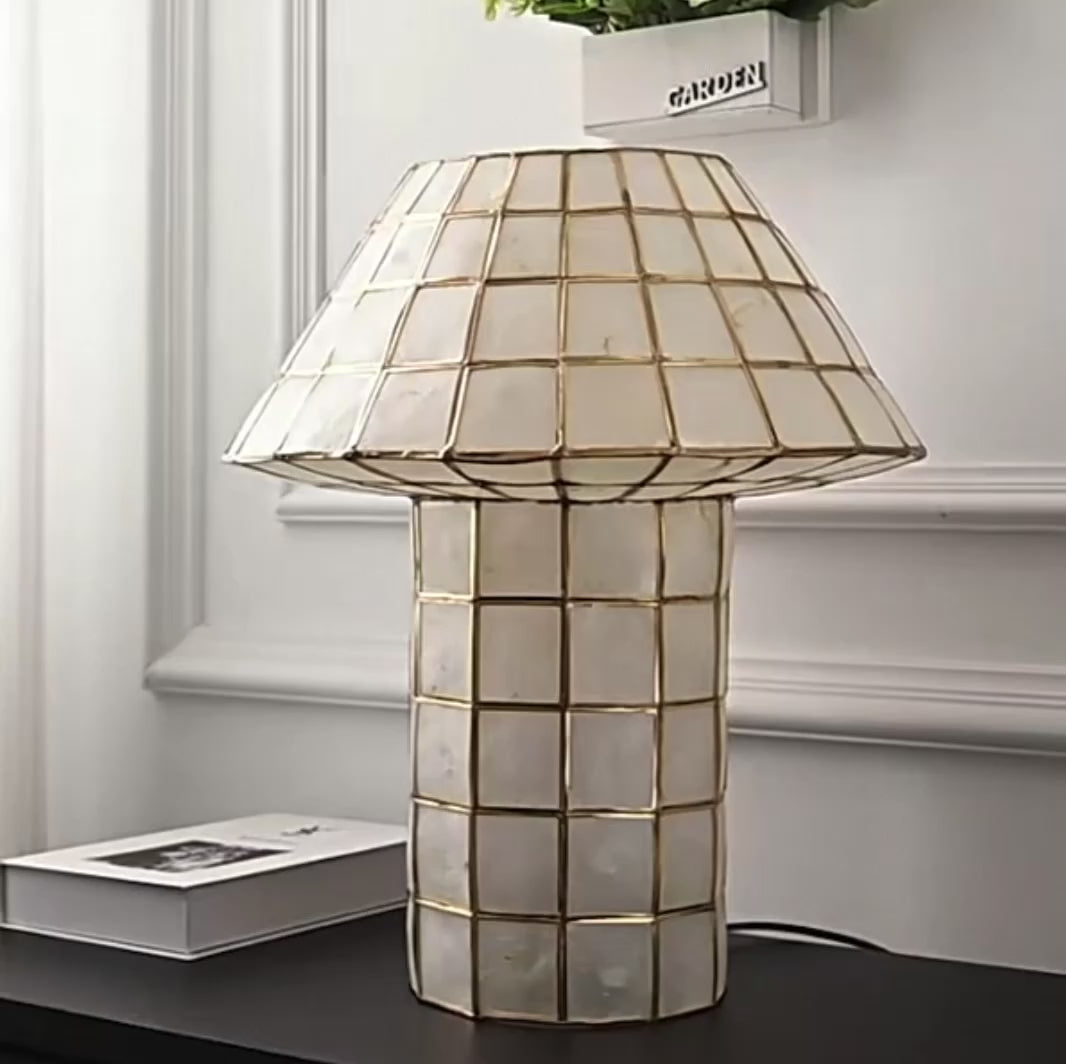 Casalolaのシーシェルテーブルランプは、幾何学的なブロンズグリッドに手作業ではめ込まれた天然のカピス貝殻で包まれた彫刻的なシルエットが特徴です。貝殻パネルの有機的な輝きが温かみのある光を優雅に拡散し、どんな空間の雰囲気も柔らかくする輝く存在感を生み出します。