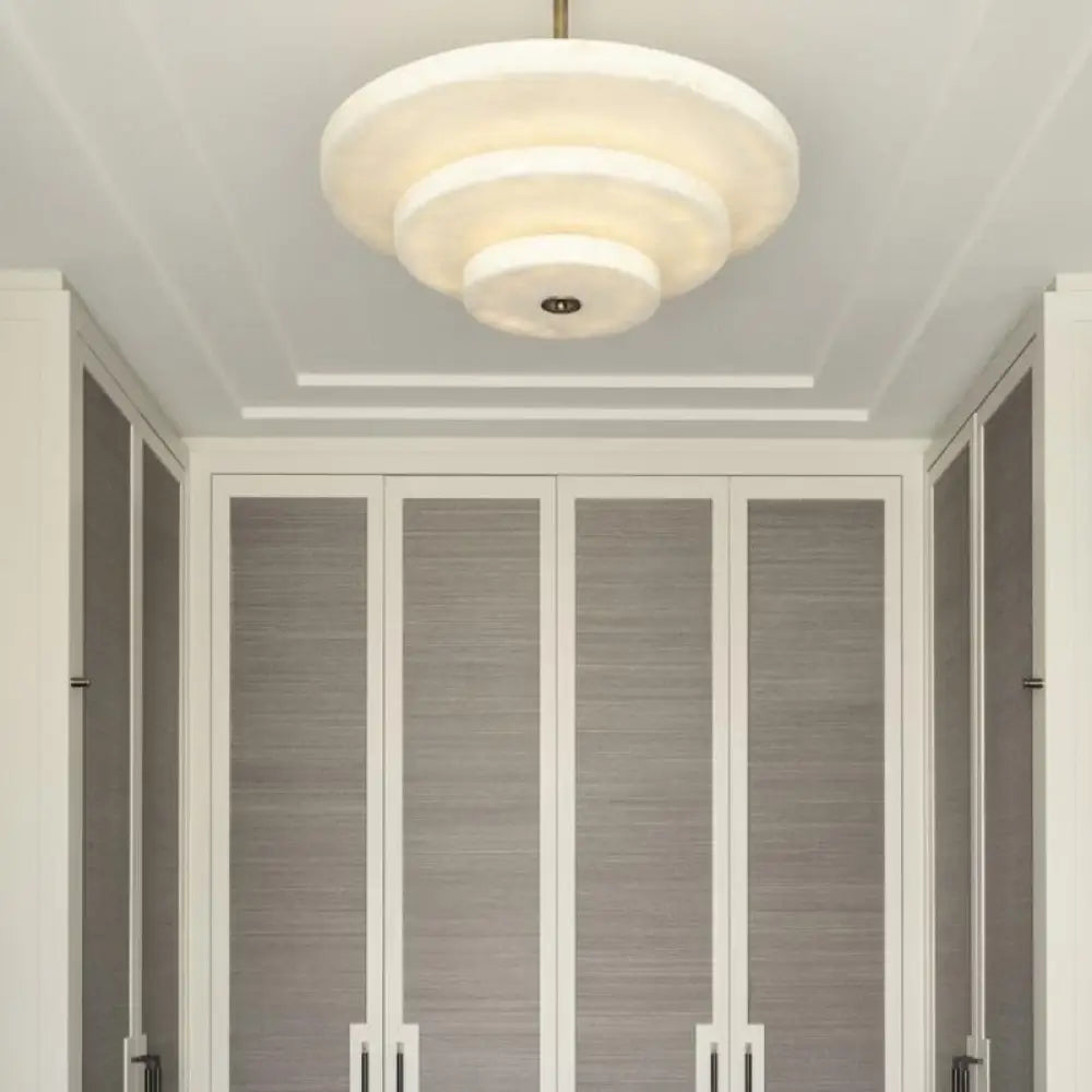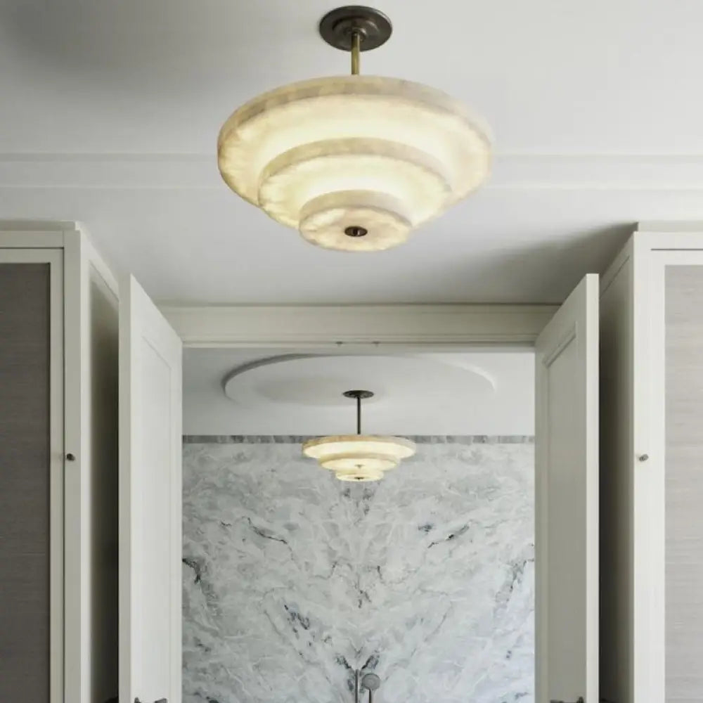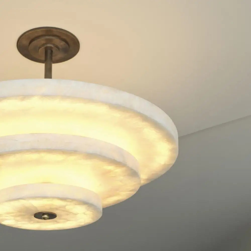 Crafted from solid marble discs supported by a copper center column, this chandelier creates a layered silhouette that casts warm, unobtrusive ambient light. The stepped arrangement of the tiers adds depth and dimension while maintaining a minimalist elegance.