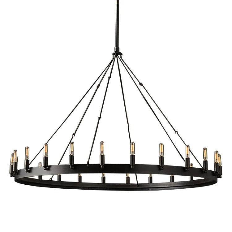 The iron candle-ring chandelier features a forged circular frame with tall candle-style LED sockets, creating a dramatic, architectural presence ideal for dining rooms, rustic foyers, and modern-industrial living spaces. The dark iron finish grounds the light into a warm, atmospheric glow suited for Rustic Modern, Industrial Loft, Farmhouse-Luxury, and RH-inspired interiors.