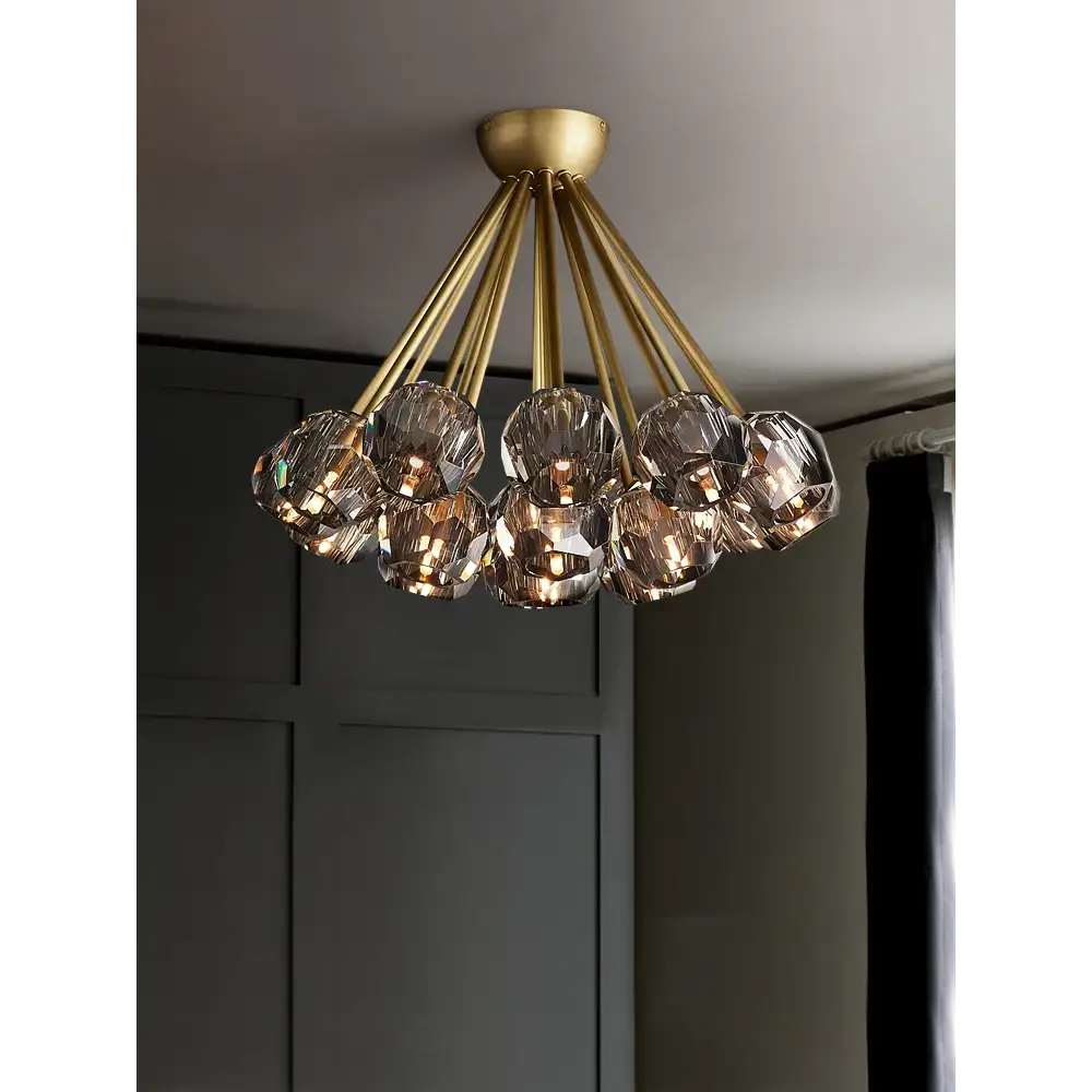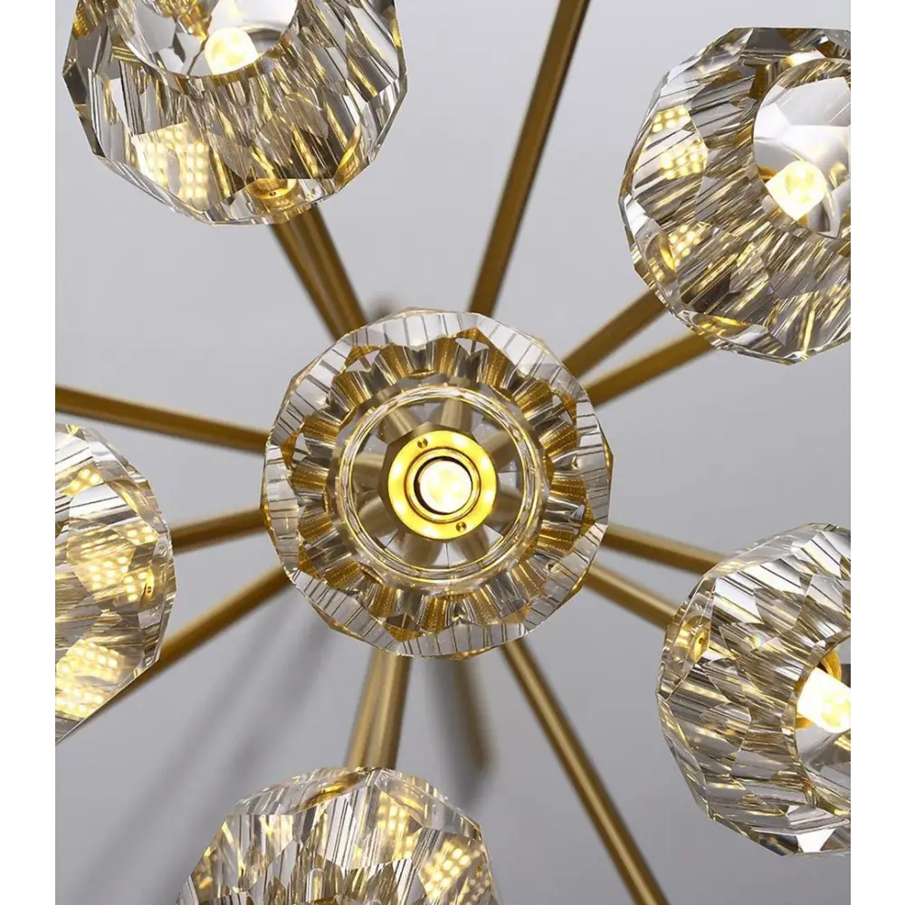 The crystal semi-flush chandelier features faceted K9 crystal globes rising from tapered copper/brass rods, creating a dramatic starburst silhouette suited to living rooms, foyers, primary bedrooms, and low-ceiling dining rooms. The tight crystal cluster delivers intense sparkle with warm LED sources, perfect for Modern Glam, Art Deco Luxe, Contemporary Luxury, and RH-inspired interiors.