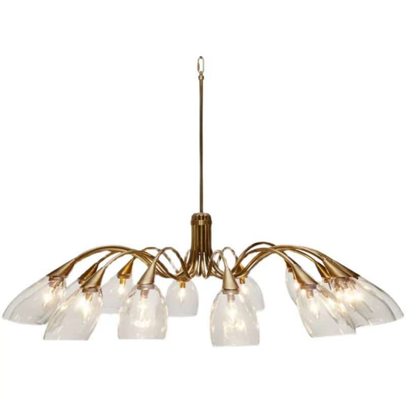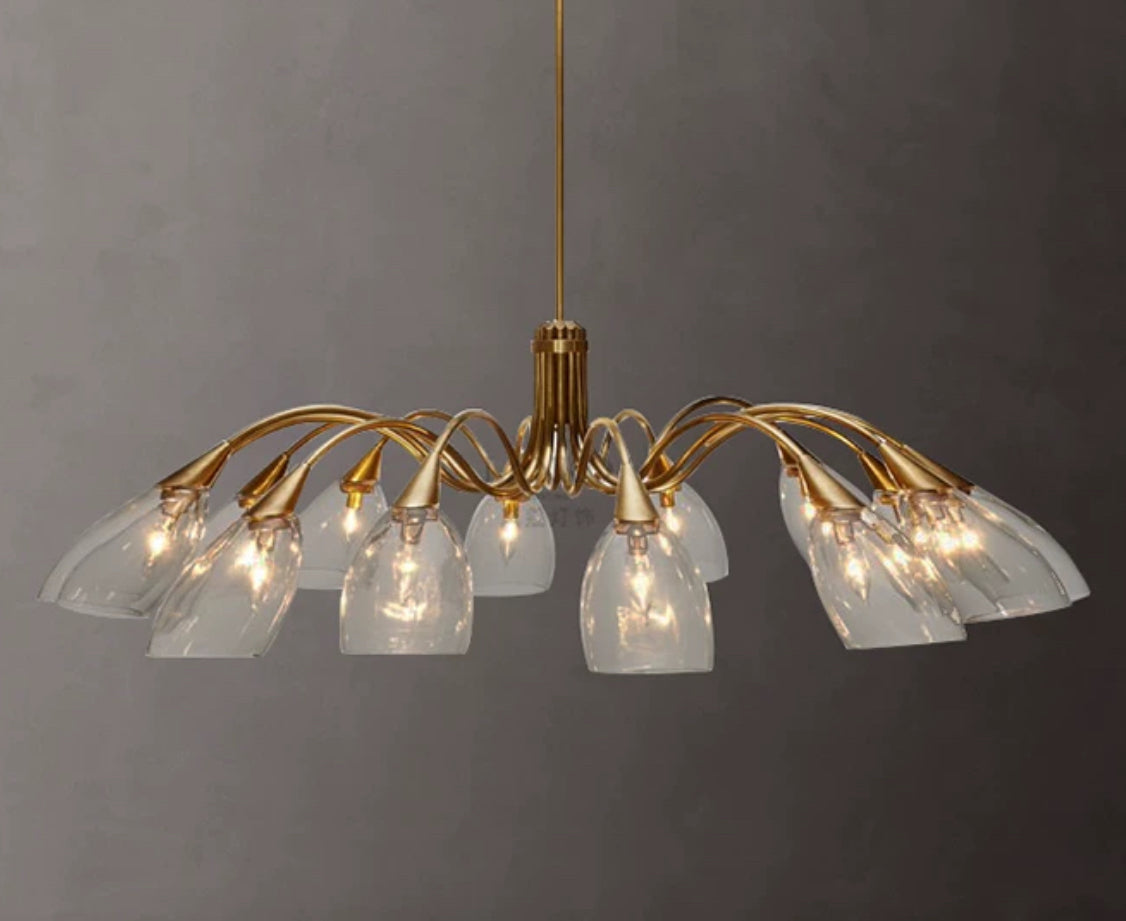 The Copper Branch Chandelier features an organically branching structure crafted from solid copper with hand-polished detailing. Each arm flows outward in a natural arc, supporting a clear glass shade shaped to diffuse light softly and evenly. The combination of warm copper and transparent glass creates a refined balance between contemporary design and sculptural elegance.