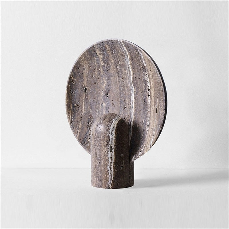 This resin table lamp by Casalola features a sculpted resin monolith paired with a circular resin diffuser that emits a warm, atmospheric glow. The textured resin surface mimics natural stone, while the backlit disc creates a soft halo effect ideal for mood-focused interiors.