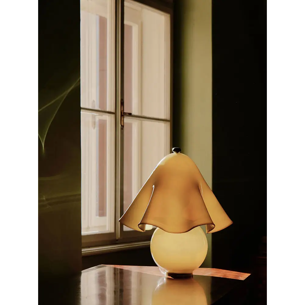 The glass table lamp by Casalola is crafted from hand-blown glass shaped into an expressive draped mushroom form. The sculptural shade features applied glass spheres that add depth and artisanal detail, echoing the craftsmanship found in contemporary Murano “Fungo” collections. The rounded glass base anchors the silhouette with a smooth reflective surface, creating a unified, organic structure.