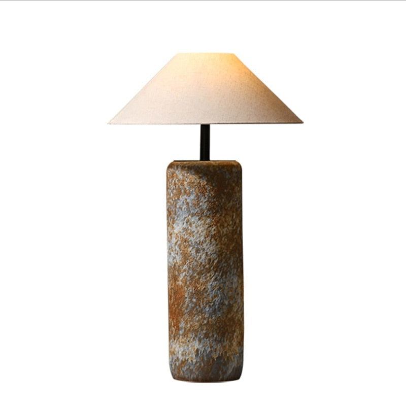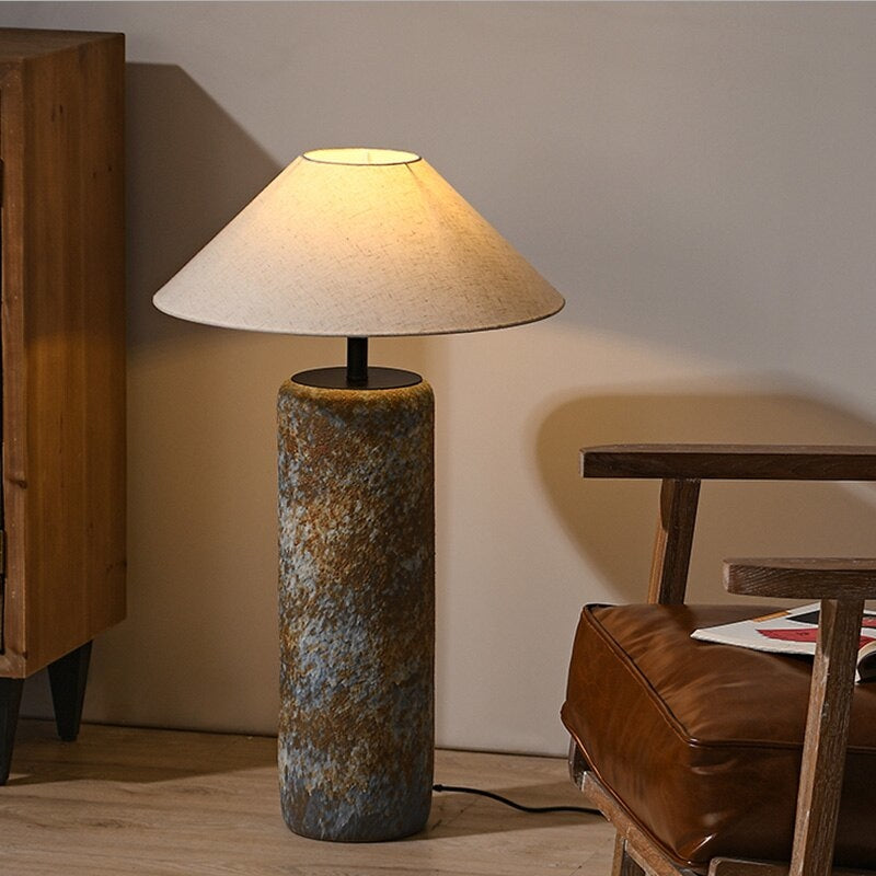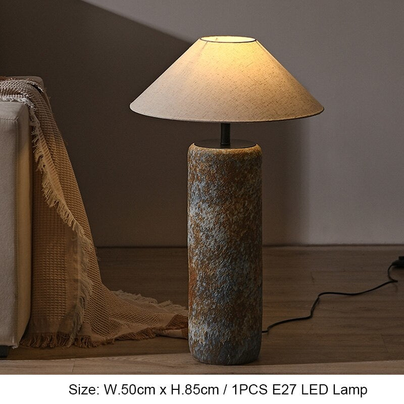 The lamp features a durable, painted ceramic body that showcases the beauty of natural textures and imperfections, complemented by a high-quality fabric shade.