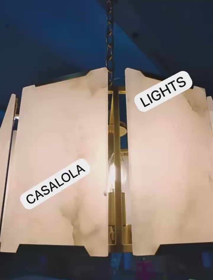 Люстра состоит из нескольких скошенных панелей из алебастра, расположенных в непрерывном барабане вокруг медного каркаса. Каждая панель индивидуально формована и отполирована, создавая естественные вариации и глубину при освещении. Тёплое свечение светодиодов подчёркивает минеральные прожилки камня, создавая мягкую, изысканную атмосферу.