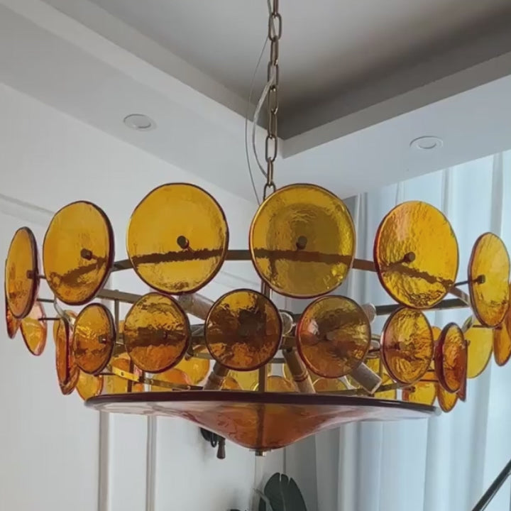 Скульптурные янтарные стеклянные диски в стиле Мурано искусно сочетаются с вручную отделанной фурнитурой из винтажной латуни в этом потрясающем потолочном светильнике. Каждый диск демонстрирует богатые, теплые оттенки янтарного стекла Мурано, напоминающие традиционное венецианское мастерство. Светильник поставляется в течение 3 недель и предлагает настраиваемую длину цепи, позволяя идеально подобрать высоту для вашей тщательно подобранной столовой, прихожей или другого жилого пространства. Эта люстра из янтарного стекла Мурано добавляет нотку вечной элегантности и обеспечивает теплое, уютное свечение, превращая выбранное вами пространство в захватывающий центр внимания. Тщательная ручная отделка винтажной латунной фурнитуры дополняет стекло, создавая гармоничное сочетание классического и современного дизайна. Эта люстра из стекла Мурано — не просто светильник; это выразительный элемент, который поднимает ваш интерьер на новый уровень.