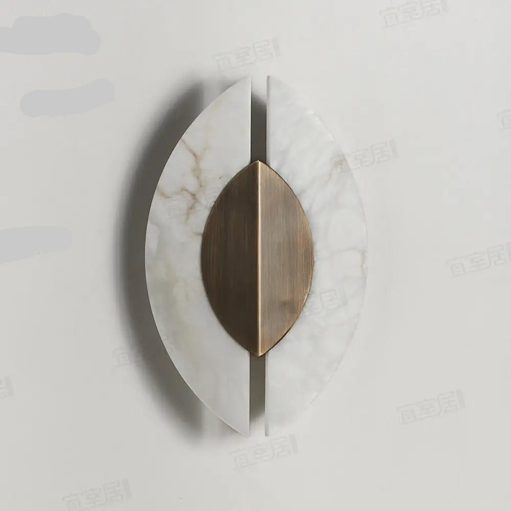 The alabaster and brushed-brass wall sconce features two carved stone wings flanking a sculptural brass center plate, creating a soft halo of diffused light. The natural veining of the alabaster combined with the warm brass detailing brings a refined presence to living rooms, bedrooms, hallways, and luxury powder rooms.